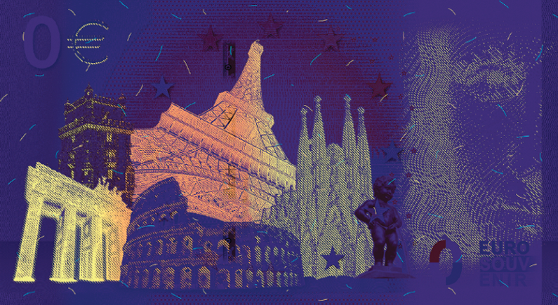The 0 Euro Souvenir banknotes are produced on genuine banknote paper in a world-renowned securities printing house with professional security features. This is certainly a major reason for their success with tourists and collectors. These features include watermarks, microprinting, seethrough register, tactile elements as used on genuine banknotes for the visually impaired, UV features, as well as a broken security stripe and a hologram.